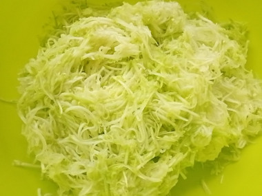 Как сделать кабачковые оладьи с сыром на сковороде? Подготовьте продукты. Кабачки подойдут и молодые, и более зрелые. Молоденькие достаточно просто помыть, а со старых срежьте твердую кожу и удалите семена. Затем натрите кабачки на мелкой терке или измельчите блендером. Кабачковую массу хорошо отожмите руками, получившуюся жидкость слейте.