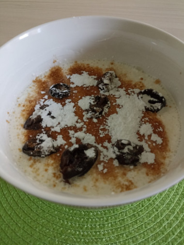 Понравился такой быстрый и вкусный завтрак. Добавил чернослив, сахарную пудру и немного разогрел в микроволновке.
