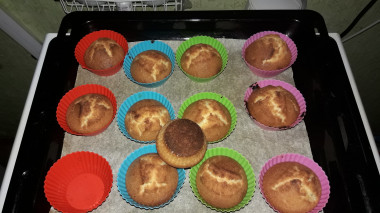 Пекла классические кексы в формочках в духовке 25 минут при температуре 220° (из-за особенностей работы моей духовки). Кексы очень "подросли". Где-то на пятнадцатой  минуте, подумав, что они уже готовы, проткнула  один кекс деревянной шпажкой. Увидев на шпажке  прилипшее тесто, продолжила готовку.