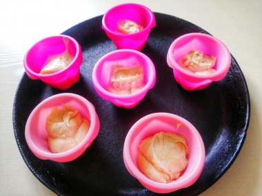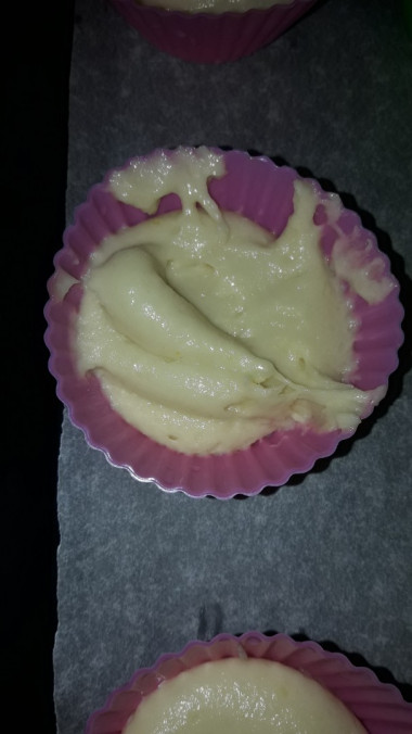 Тесто получилось средней густоты: не жидкое, но и не густое. Заполнила им формочки на 2/3 объёма формочек, но можно было и чуть побольше. Получилось у меня 12 кексов.