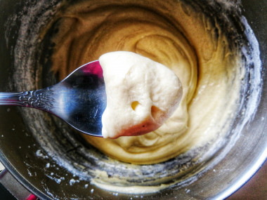 В масляную массу вбейте по одному яйца, хорошо взбивая после каждого. Обязательно мойте яйца перед использованием, так как даже на кажущейся чистой скорлупе могут находиться вредные бактерии.