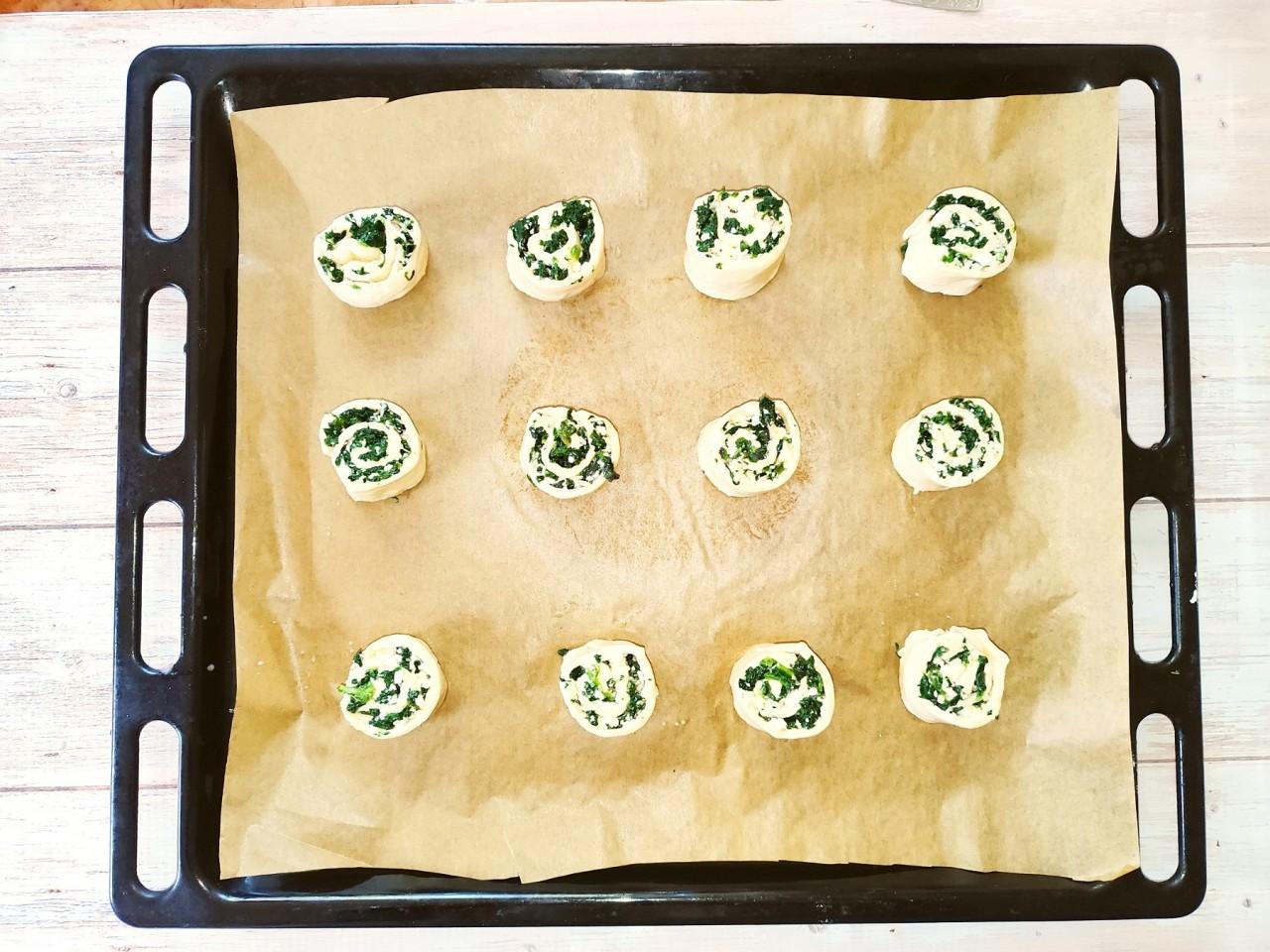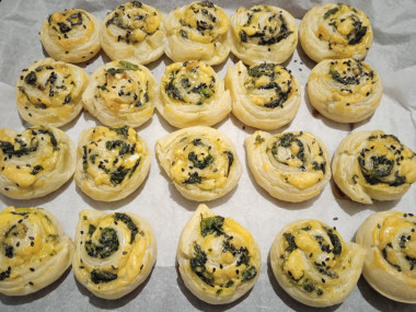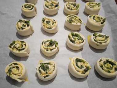 Приготовила слоёные пирожки со шпинатом и сыром по этому рецепту. Тесто купила слоёное дрожжевое замороженное. Пока готовила начинку, тесто немного разморозилось при комнатной температуре. Шпинат брала свежий и пожарила его на сливочном масле с чесноком на сковороде. Взяла твердый сыр и крупно натерла. Слоёное тесто раскатала и разложила начинку из шпината и сыра. Посолила и поперчила. Завернула рулетом и нарезала на кусочки. Разложила рулетики на деко с пергаментной бумагой и смазала взбитым яйцом. Выпекала 20 минут при 180 С. Чуть остывшие пирожки посыпала черным кунжутом. Это очень красивое блюдо и аппетитное. Особенно вкусные пирожки в теплом виде. Ребенок их назвал "улитки с зелёной начинкой" ) Начинка великолепная. Сыр расплавился, шпинат сочный, тесто хрустящее. Прекрасное сочетание всех ингредиентов. Это не только очень оригинально смотрится, но и потрясающе вкусно. Обязательно повторю такие рулетики и всем рекомендую. Большое спасибо автору за отличный рецепт!