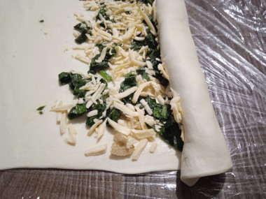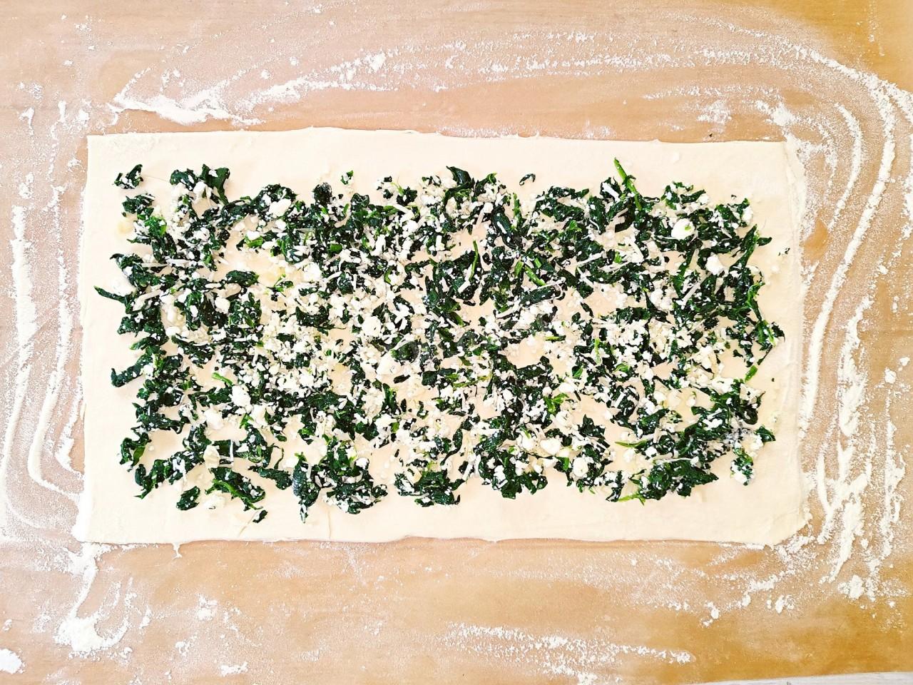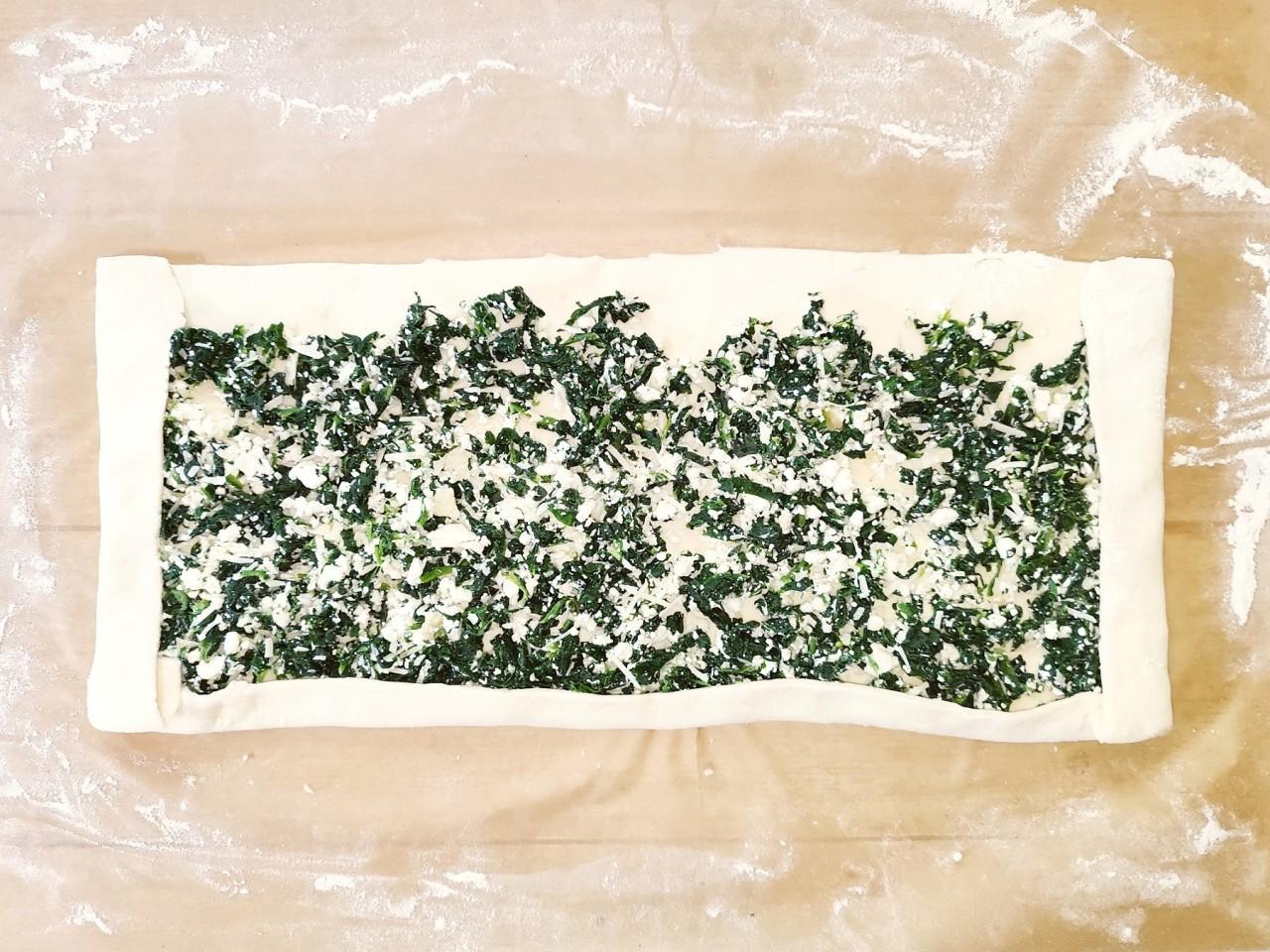 Выложите начинку из шпината и сыра на тесто, отступая от краёв 1 сантиметр, а край, к которому будете сворачивать рулет, оставьте без начинки 1,5 сантиметра.