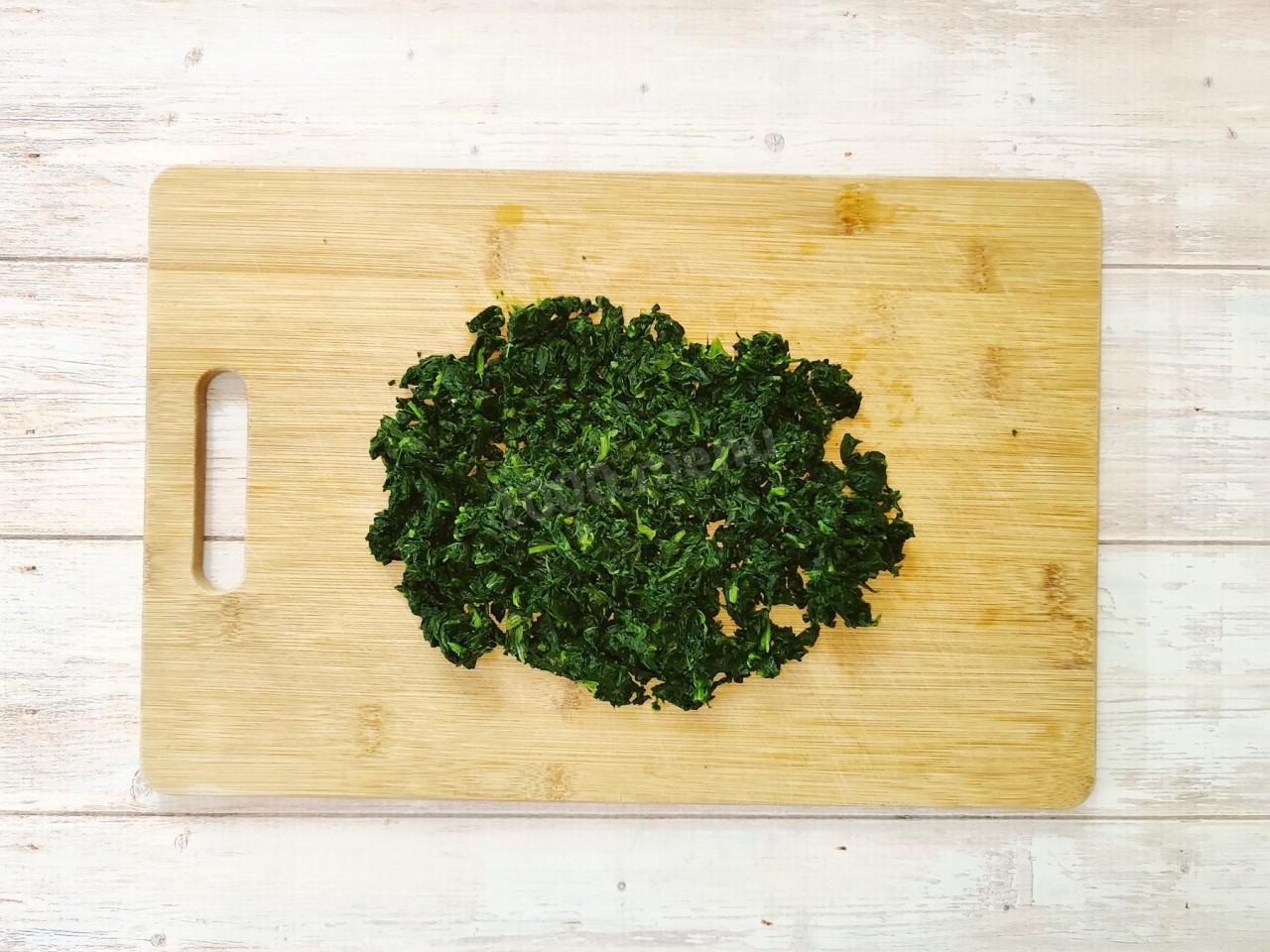 Размороженный шпинат хорошо отожмите от лишней влаги и мелко нарежте, насколько возможно.