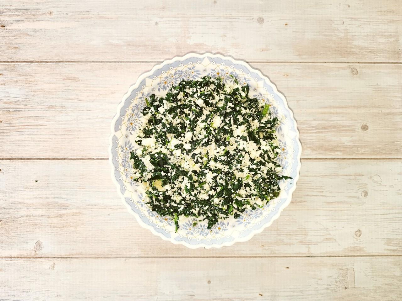 Соедините мелко резаный шпинат с тертым пармезаном и размятой фетой, хорошо перемешайте.