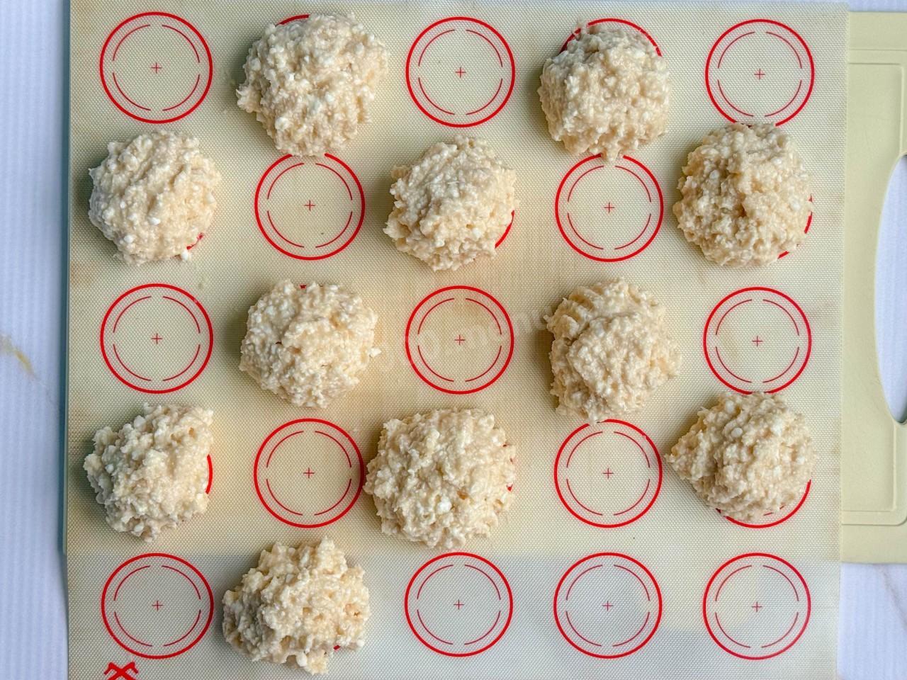 Из подготовленной начинки сформируйте небольшие шарики не больше 2 см диаметром. Я выложила столовой ложкой кусочки одинакового размера (у меня получилось 18 шт.), шарики буду скатывать уже из примороженной массы. Выложите начинку на силиконовый коврик или пергамент и уберите в морозилку минимум на полчаса. Не пропускайте этот шаг. Если положить мягкий творог в жидкое тесто, он просто в нем растворится, и вы не получите красивой кексов с начинкой внутри.