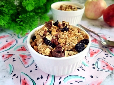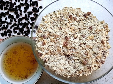 Количество порций увеличила, у меня было две упаковки овсяных хлопьев по 350 г. Кстати в овсянку были добавлены кусочки банана и яблока, что тоже хорошо. Грецкие орехи у меня были замороженные, нарубила их крупно и отправила к хлопьям. Клюкву заменила на финики. Думаю, тут можно добавить любые сухофрукты по вкусу. Для заливки воды взяла немного меньше, а сахар не добавляла. При перемешивании у меня появились слипшиеся комочки. Когда-то я часто запекала мюсли, тогда заливала хлопья только растительным маслом и медом.