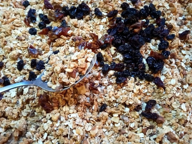 Выложите хлопья на противень и равномерно распределите по всей поверхности, при желании можете застелить его пергаментной бумагой и смазать каплей масла или используйте силиконовый коврик. Поставьте противень в разогретую до 150 градусов при 150 градусах запекайте, часто помешивая. Через 15 минут добавьте изюм и вяленую клюкву, перемешайте и запекайте еще 10 минут. Время указано приблизительно, ориентируйтесь на свою технику и степень готовности мюсли.