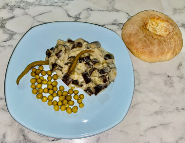 Тушеные баклажаны в сметане я подала с зеленым горошком и отварным картофелем.