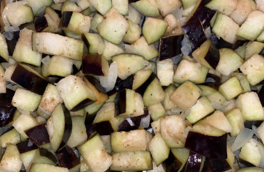 Помойте баклажаны и нарежьте небольшими кубиками. Залейте их холодной водой примерно на 15 минут, потом слейте воду, сполосните баклажаны, откиньте на дуршлаг и обсушите бумажными полотенцами. Это нужно для того, чтобы избавиться от возможной горечи, присущей этому овощи.
