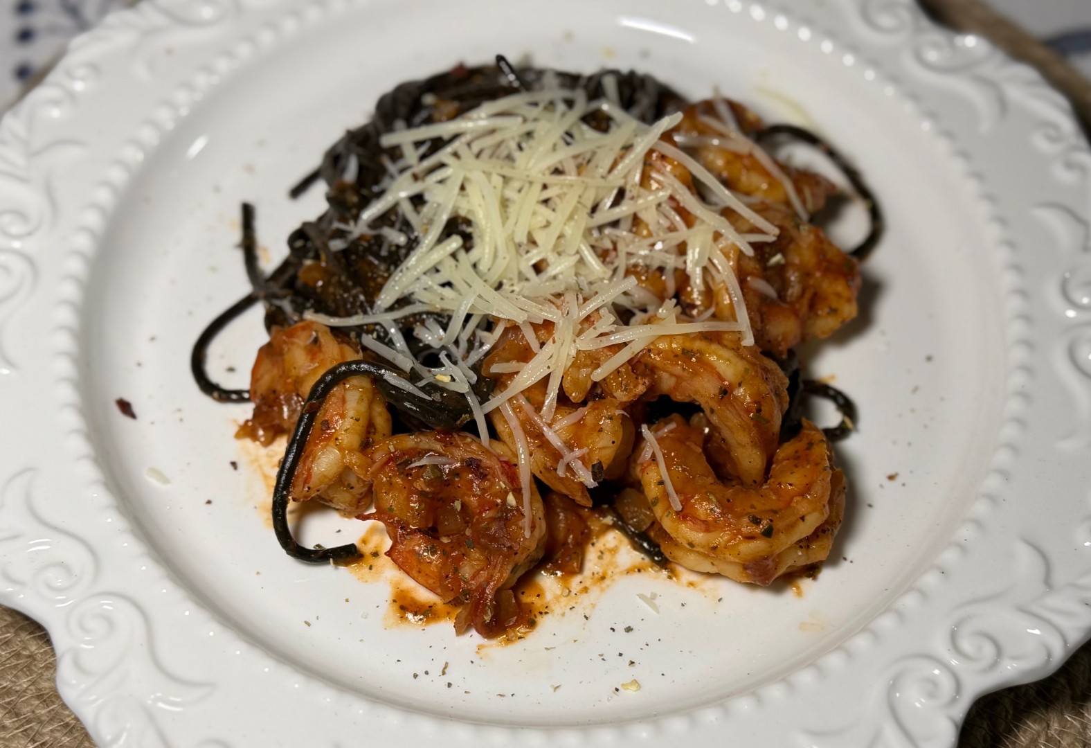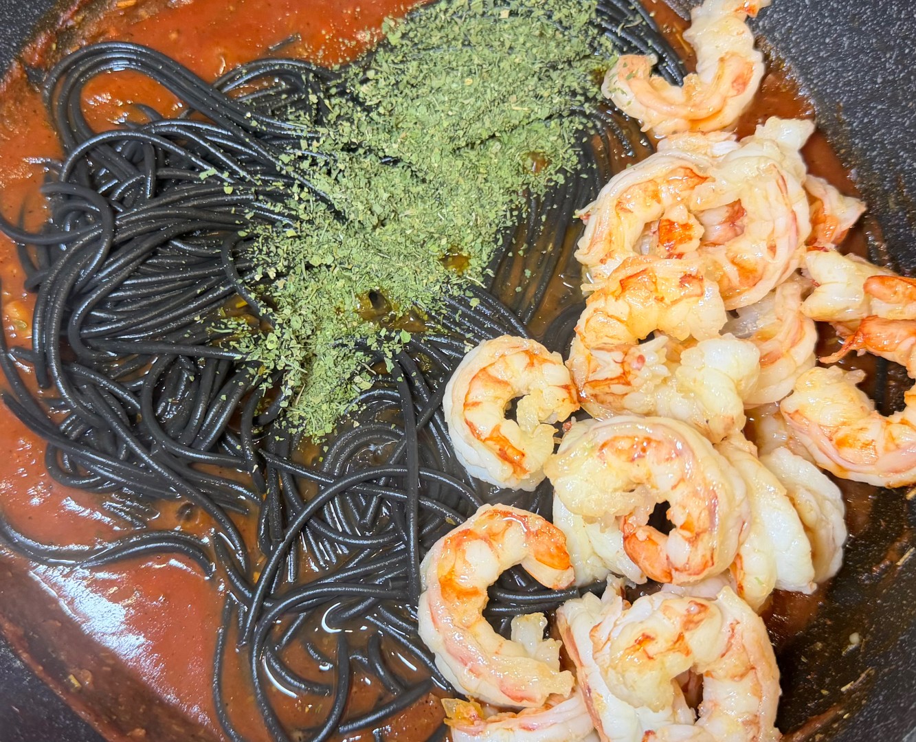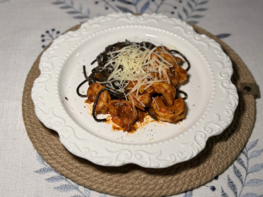 Из морепродуктов у меня были только крупные креветки, а все травы были сухими - вкус все равно изумительный. Паста была с чернилами каракатицы и как нельзя кстати сюда подошла, а легкий запах белого сухого вина добавил ей шарма. Рекомендую ❤️