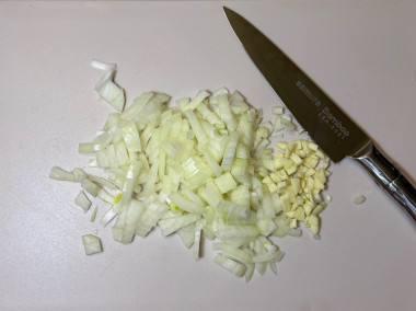 Лук нарежьте мелкими кубиками. Чеснок мелко порубите. Петрушку вымойте, обсушите и мелко порубите.Шаг 3. Как правильно обжарить морепродукты?
