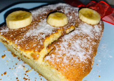 За неимением дома шоколада и малины я украсила бананом и сахарной пудрой.