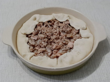 Пока тесто "отдыхает", приготовьте начинку. Горбушу достаньте из баночки, чтобы стекла лишняя жидкость.