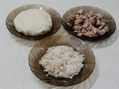 Остальную муку подсыпайте по необходимости, замешивая тесто руками. Тесто получается нежным и мягким. У меня оно совсем немного липло к рукам, но больше я муки не добавляла, чтобы пирог получился нежнее. Заверните тесто в пищевую пленку и оставьте на столе на 20 минут.