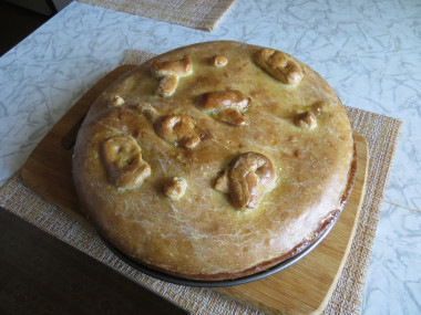 Вторую часть теста раскатайте аналогично первой, выложите ее поверх начинки. Края теста хорошо соедините. В центре пирога сделайте небольшое отверстие для выхода пара. По желанию украсьте пирог различными фигурками из маленького кусочка теста. С помощью кулинарной кисти смажьте верх пирога яичной смесью.