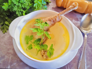 Сделала на обед суп из куриных ножек. Использовала для приготовления супа ножки домашней курицы. Добавила в чашу мультиварки лук, имбирь, домашние куриные ножки. От себя добавила лаврушку и перец горошком. Воды налила 2,5 литра, а соли положила чайную ложку. Готовила в режиме "суп" в течение двух часов, так как курица домашняя. Попробовала и досолила суп. Невероятный бульон, желтенький, ароматный и очень насыщенный, благодаря домашней курице. Даже без овощей суп вышел фантастический! Вместо кинзы использовала петрушку по своим соображениям. Это очень вкусный бульон с курицей! Большое спасибо автору!