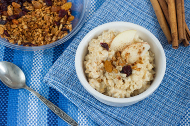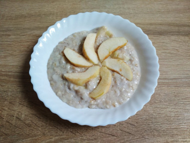 Готовую овсяную кашу дополните тонкими дольками яблок, чуть-чуть присыпьте молотой корицей. Также кашу можно дополнить другими наполнителями по желанию. Приятного аппетита!