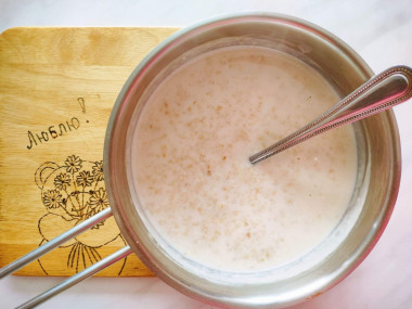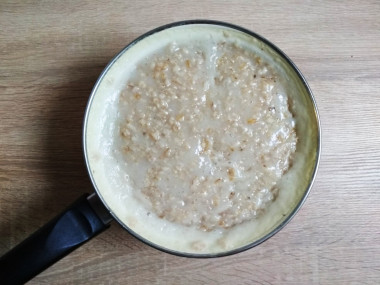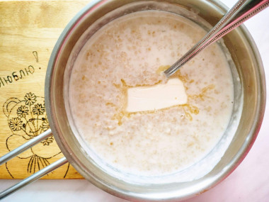 Положите овсяные хлопья. Перемешайте и на минимальном огне готовьте около 15 минут. За это время пару раз перемешайте кашу. Точное время будет зависеть от особенностей работы вашей плиты.