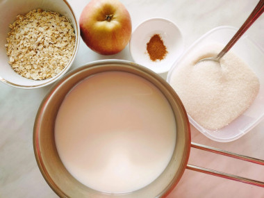 Как сделать овсяную кашу с яблоком и корицей? Подготовьте все необходимые ингредиенты. Молоко можно взять любой жирности. Яблоко берите сладкое, сочное и мягкое. Овсянку выбирайте не быстрого приготовления. С выбором поможет статья по ссылке в конце рецепта. Количество сахара можно регулировать по вкусу. Также можно заменить сахар на сахарозаменитель, который не боится термической обработки.