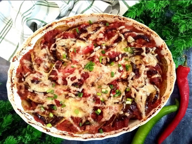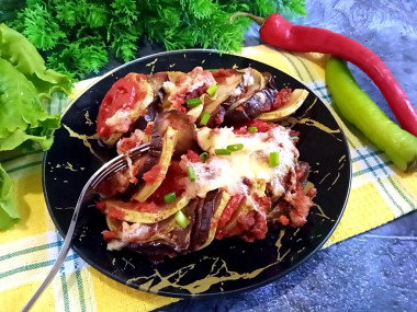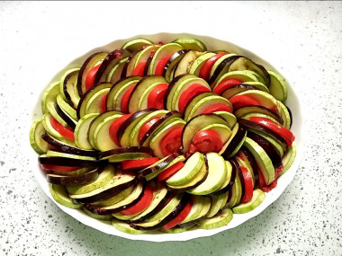 Основные компоненты - это кабачки, баклажаны и помидоры. Нарезала их тонкими кружками. Баклажаны предварительно посыпала солью и оставила на 15 минут, чтобы вышла горечь. Затем быстро промыла. Болгарский перец решила измельчить вместе с луком, а также добавила помидоры. Эту смесь распределила по дну формы. Так даже удобнее выкладывать кружки овощей.