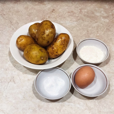 Картофель отварила, остудила , очистила и размяла в пюре. Добавила яйцо, перемешала и затем муку. Вымесила тесто, раскатала и вырезала квадратики, кружочки. Отварила в кипящей подсоленной воде 10 минут.