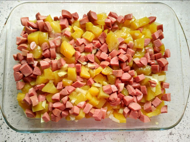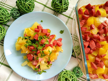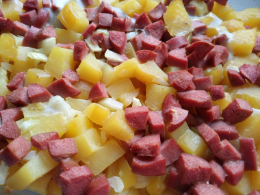 Очень нужный рецепт, как раз на случай, когда нет времени и желания чистить картошку. Картофельная запеканка с колбасой готовится между делом, это удобно. Картошку отварила с утра, она как раз остыла к моменту запекания. Вместо колбасы взяла говяжьи сосиски, нарезала их на небольшие кусочки. Лук для запеканки нарезала помельче. Для заливки взяла 10% сливки и в два раза больше яиц, чтобы заполнить все дно формы. Запекала пол часа, как раз яйца "схватились" за это время. Замечу, что лук остался немного хрустящим, в следующий раз попробую его поджарить, так он и приготовиться успеет и вкуснее будет. Сыра у меня не нашлось, но и без него вкусно получилось. Эта запеканка больше всего понравилась моим детям, ведь в ней есть сосиски) Это просто отличный вариант для перекуса или ужина.