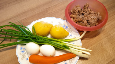 4. Картофель режем маленькими кубиками, морковь и яйца (белки и желтки в отдельные миски) трем на терке.