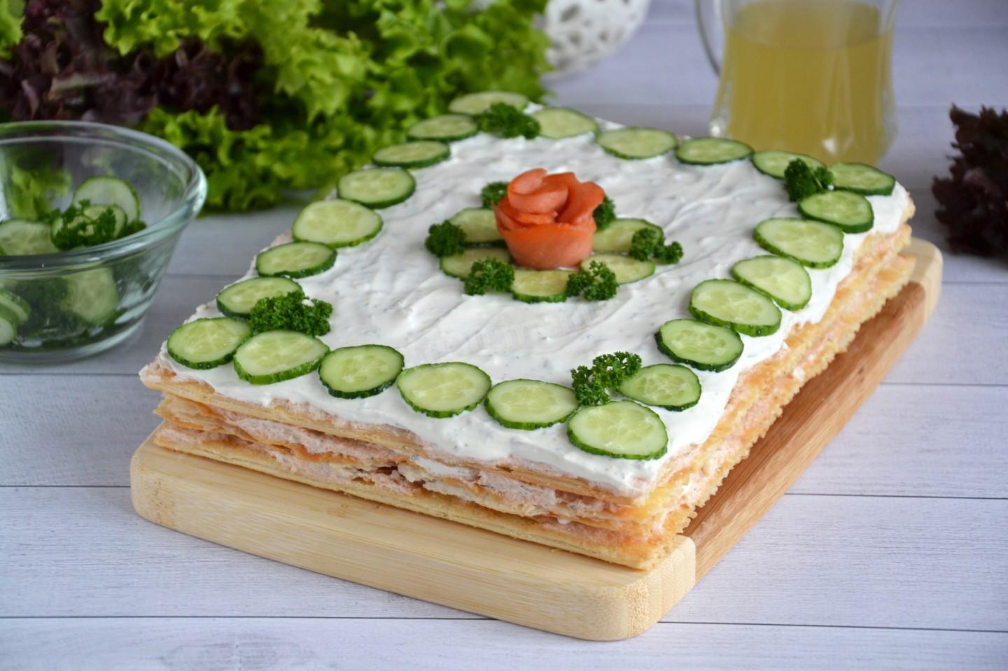 Если красной рыбы нет, приготовьте торт Наполеон с рыбными консервами.