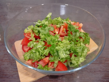 Соедините помидор, огурец, листья салата и укроп.
