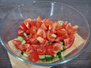 Помидор и огурец нарежьте небольшими кубиками.