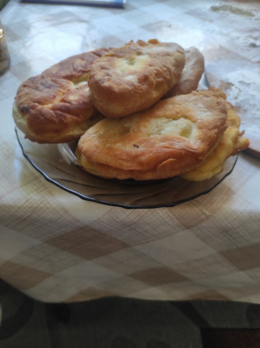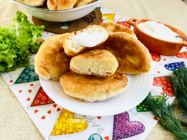 Быстро замесила тесто по рецепту, оно получилось, мягкое, нежное и податливое. Для начинки отварила картофель, обжарила лук и все это соединила, налепила пирожки и обжарила на растительном масле.