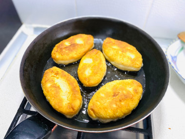На сковороде разогрейте растительное масло для жарки. Выложите в него подготовленные пирожки и обжарьте их с двух сторон до румяной корочки на небольшом огне. При выборе сковороды и масла для жарки вам помогут статьи под рецептом.