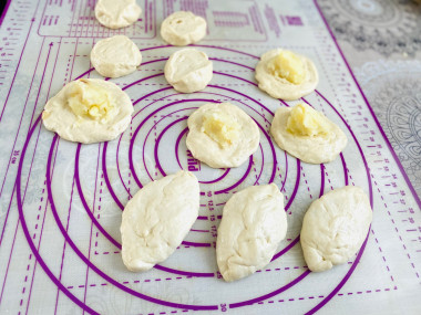 Тесто разделите на 10-12 частей. Каждую раскатайте в лепешку, в центр положите картофельную начинку. Защипните пирожки.