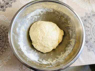 Насыпьте просеянную муку и замесите тесто. Будьте готовы к тому, что муки может потребоваться больше или меньше, чем указано в рецепте. Ориентируйтесь не на количество муки, а на желаемую консистенцию теста. Лучше добавлять муку порциями, вымешивая тесто после каждой. Тесто должно стать однородным, эластичным, но остаться мягким. Готовое тесто накройте полотенцем или пленкой и оставьте полежать минут на 15. Читайте статью о свойствах муки под рецептом.