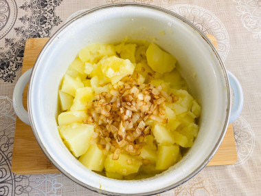 Слейте с готовой картошки воду, при этом специально отлейте небольшое ее количество — она понадобится для регулирования густоты начинки. Разомните картошку в пюре, смешайте ее с луком. Если начинка получится слишком крутой, то влейте в нее немного оставленной воды. Попробуйте начинку на вкус — она должна быть вкусной.