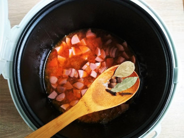 Соедините томатную пасту и половину воды, полученную смесь вылейте в зажарку. Добавьте сахар, лавровый лист, душистый перец и гвоздику. Закройте мультиварку и готовьте минут 8. Затем извлеките специи, которые уже отдали свой аромат блюду. Добавьте сосиски.