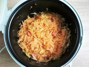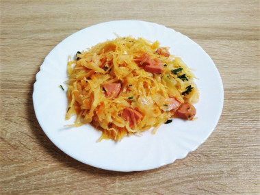 Блюдо простое, но вкусное. Смотрите видео приготовления тушеной капусты с сосисками. С ним понятнее.
