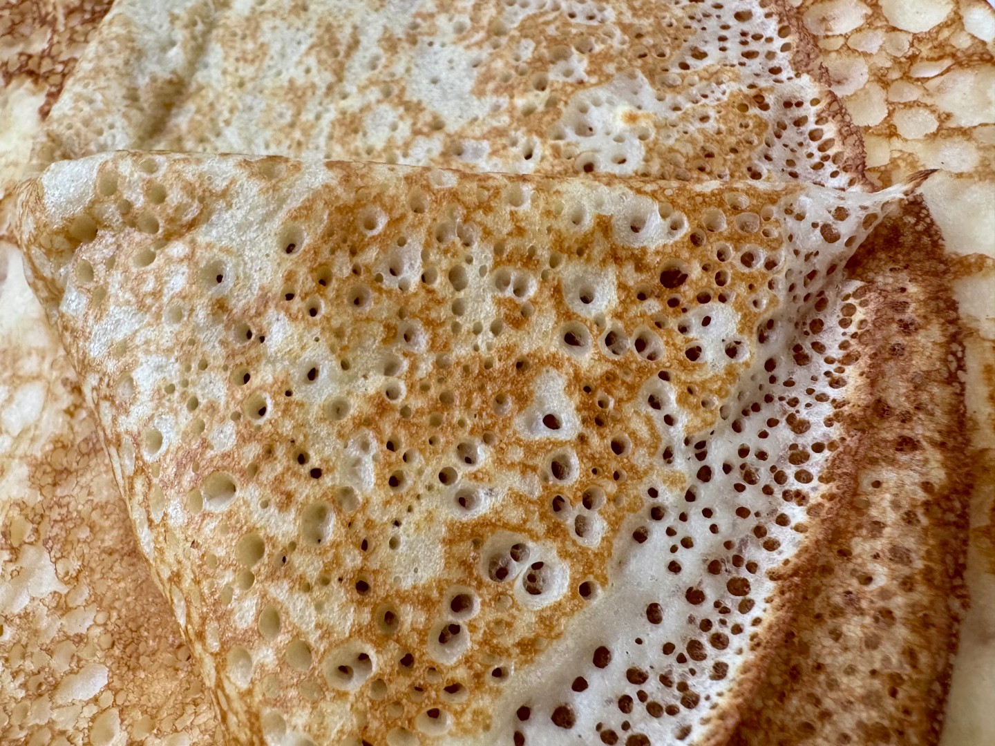 Секрет дырочек: тесто должно быть консистенции жидкой сметаны и попадать на хорошо разогретую сковороду. Тогда нижний слой «схватывается» мгновенно, пузырьки воздуха устремляются вверх, образуя кружевной узор.