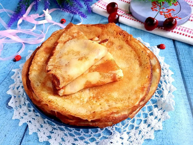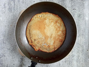 Прогрейте сковороду для выпекания блинов, смажьте ее растительным маслом и еще немного прогрейте. Вылейте порцию теста на сковороду, прокрутите, формируя округлый блин. Выпекайте буквально 1 минуту до подсушивания краев блина и переверните. Выпекайте еще полминуты. Помните про поговорку, что первый блин всегда комом! По мере выпекания ваши блинчики будут становиться более ажурными и тонкими - вы научитесь правильно подбирать порцию теста.