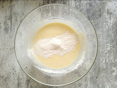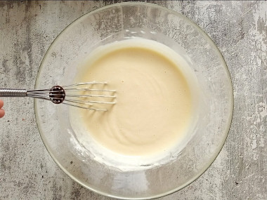Просейте пшеничную муку, добавляйте в емкость порциями, используйте муку высшего сорта. Муки может потребоваться больше или меньше. Ориентируйтесь на консистенцию теста. Оно будет немного густовато. Аккуратно взбейте венчиком или миксером, чтобы не сформировались комочки. Оставьте тесто на 20 минут - за это время клейковина в муке активизируется и еще более сгустит тесто.