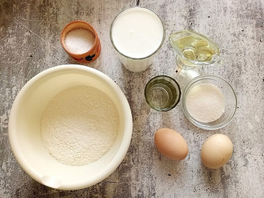 Как испечь блины с дырочками с кипятком? Подготовьте необходимые ингредиенты для создания ажурных блинов. Если куриные яйца крупные, то муки может потребоваться чуть больше и наоборот!