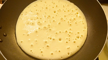 Перед первым блинчиком сковороду смазала растительным маслом, а дальше жарила без него. Для появления дырочек на поверхности блина, нужно хорошо накалить сковороду.