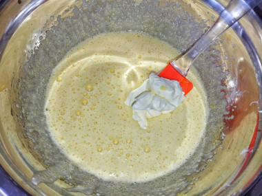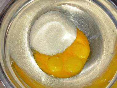 Взбейте желтки с сахаром. Должна получиться белая пышная масса. Ко взбитым желткам вмешайте подтаявшее сливочное масло.