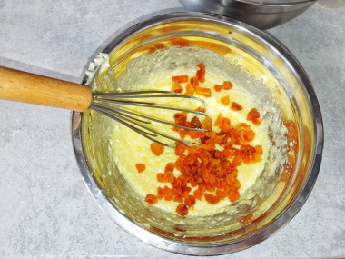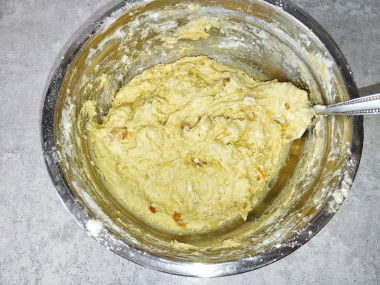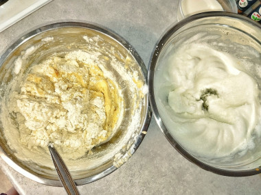 К желтково-масляной массе добавьте сухофрукты и вмешайте около 120 граммов мучной смеси. Влейте молоко и опять перемешайте. Дальше по очереди частями вмешивайте оставшуюся муку и взбитые белки.