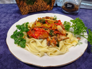 К грибам выложите нарезанные помидоры и болгарский перец. Перемешайте. Тушите все вместе около 10 минут до готовности болгарского перца. Время я указываю приблизительно - нужно всегда ориентироваться на свою плиту.