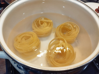 Займитесь приготовлением пасты. У меня это готовые сырые гнезда из яичной лашпи. Вы можете брать гнезда из классических макарон - тонких или потолще. Также можете сами сформировать гнезда из вареных спагетти.