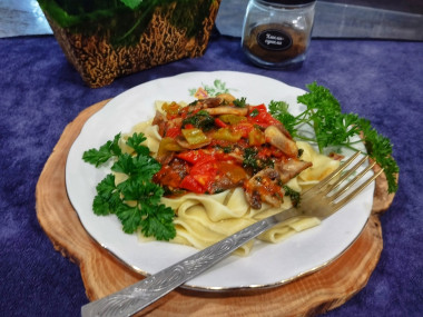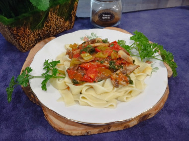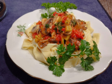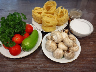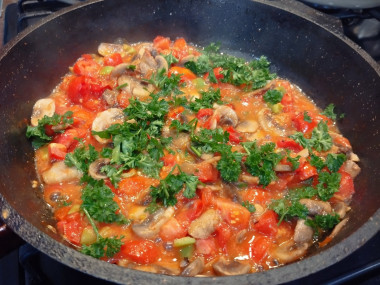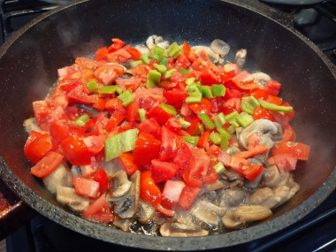 Шампиньоны обжарила на сковороде, добавила мелко порезанные помидоры и перец болгарский,посолила,перемешала. Затем добавила мелко порезанную зелень петрушки.