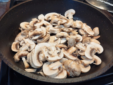 Разогрейте на сковороде растительное масло (у меня одна столовая ложка оливкового). Выложите на сковороду шампиньоны и обжаривайте их около 3 минут, помешивая.