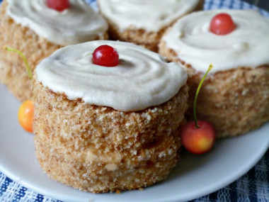 Верх и бока пирожных обмажьте кремом и обсыпьте бисквитной крошкой.